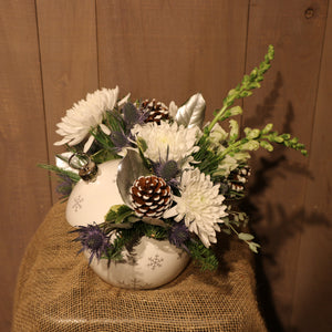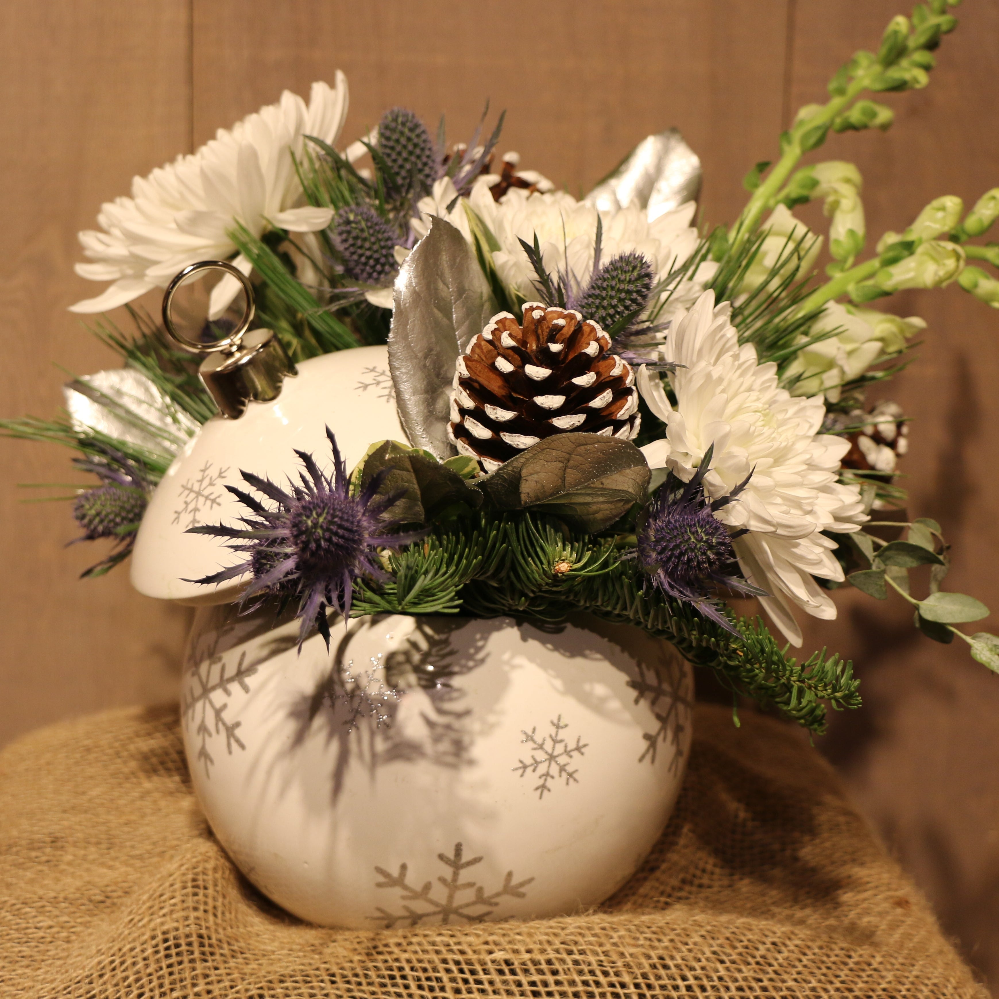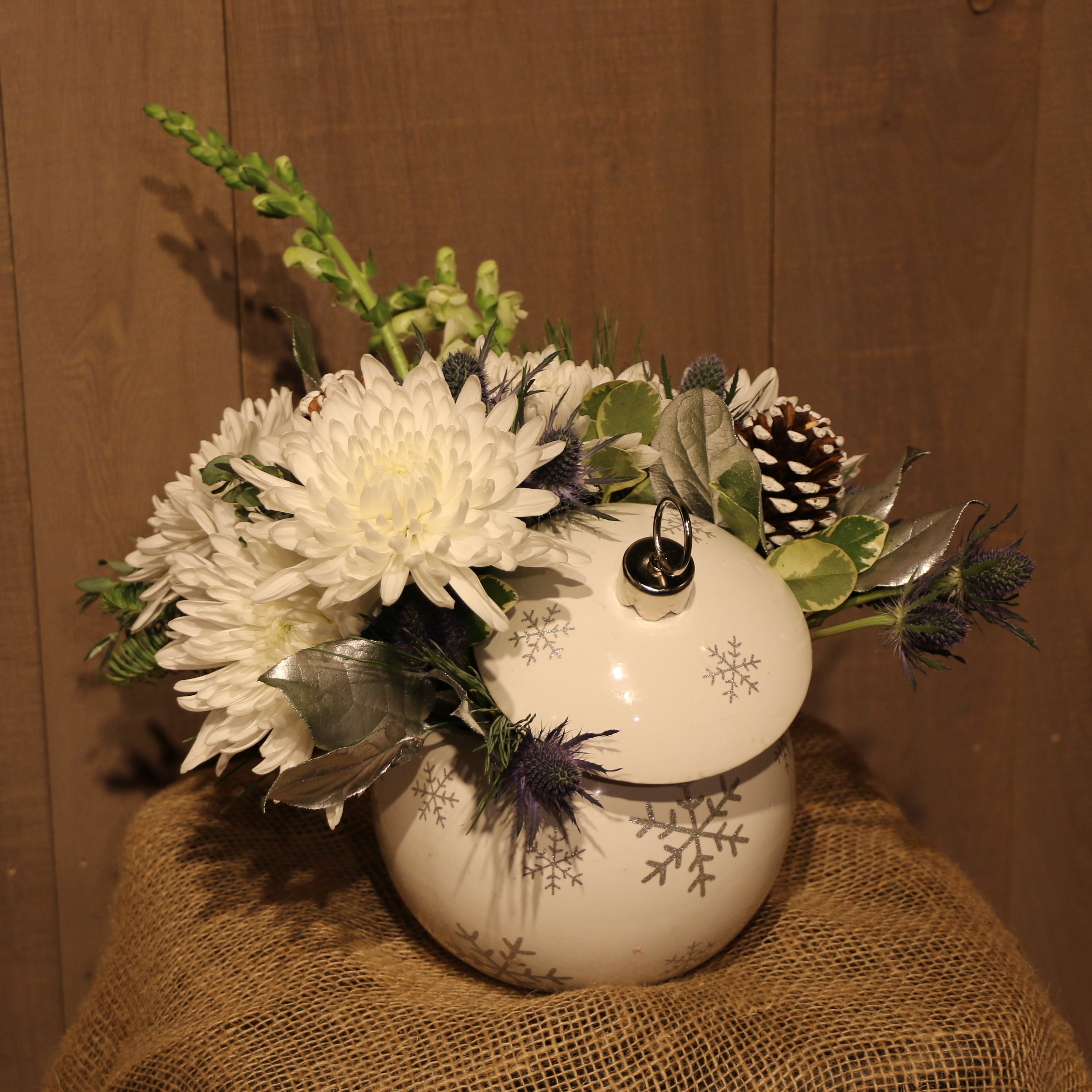 Inspired by freshly fallen snow, Snowfall delights with elegant blooms in a white ornament vase, bringing a touch of frosty charm to any space.