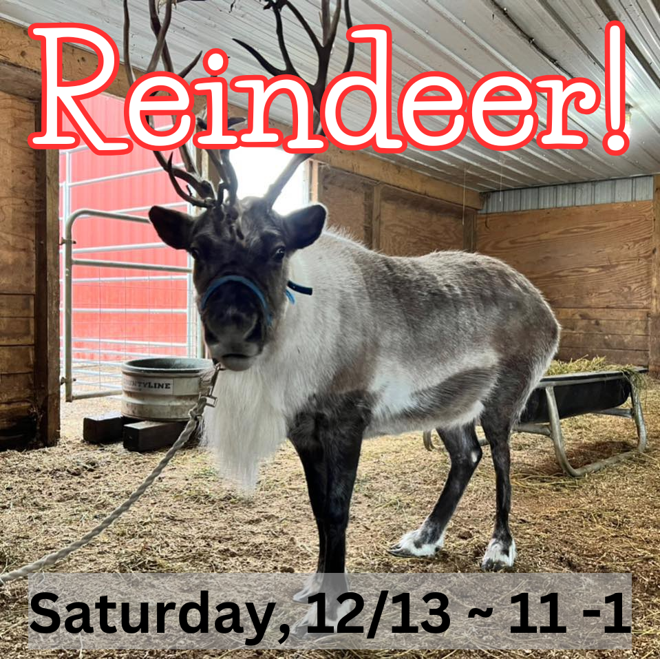 Stop by Saturday, 12/13 from 11 am – 1 pm and get a photo with Santa’s reindeer (yes, they’re real) but sorry the red nosed one won’t be joining us as he’s busy at the North Pole.