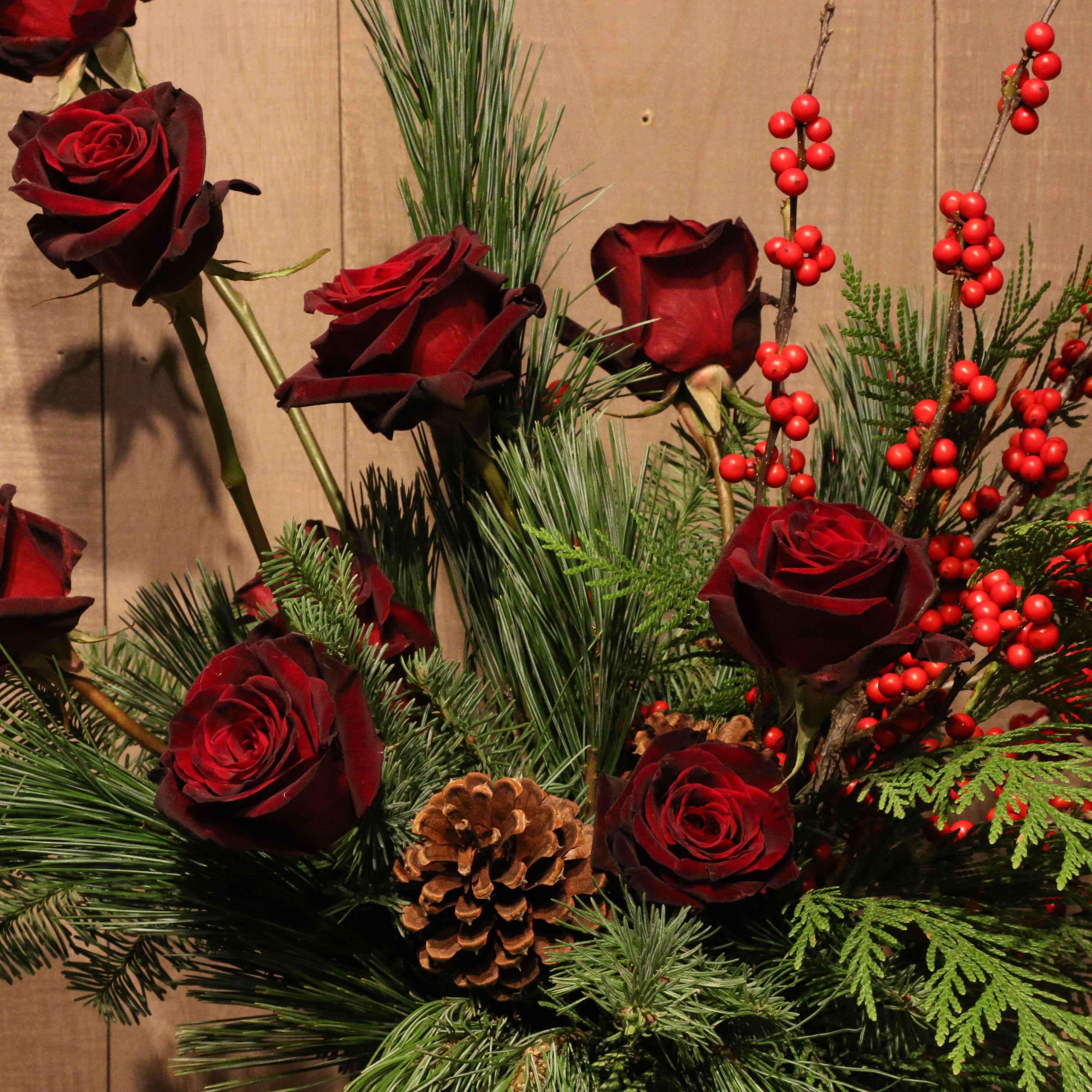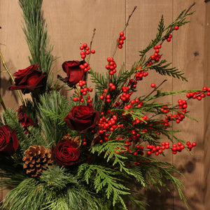 A large bouquet of Christmas greens, maroon roses, winterberry and pinecones. A lush, chic arrangement for a lover of texture!