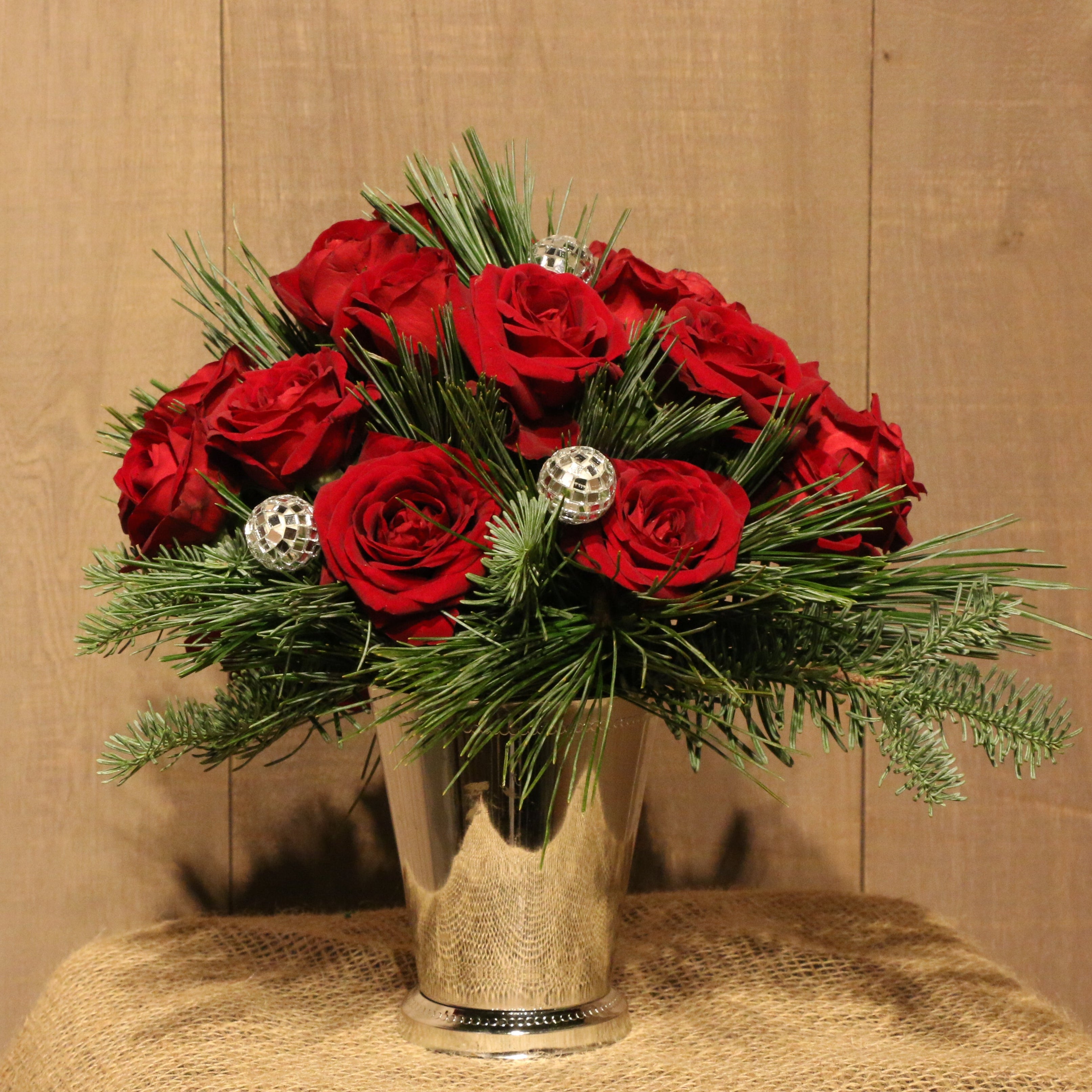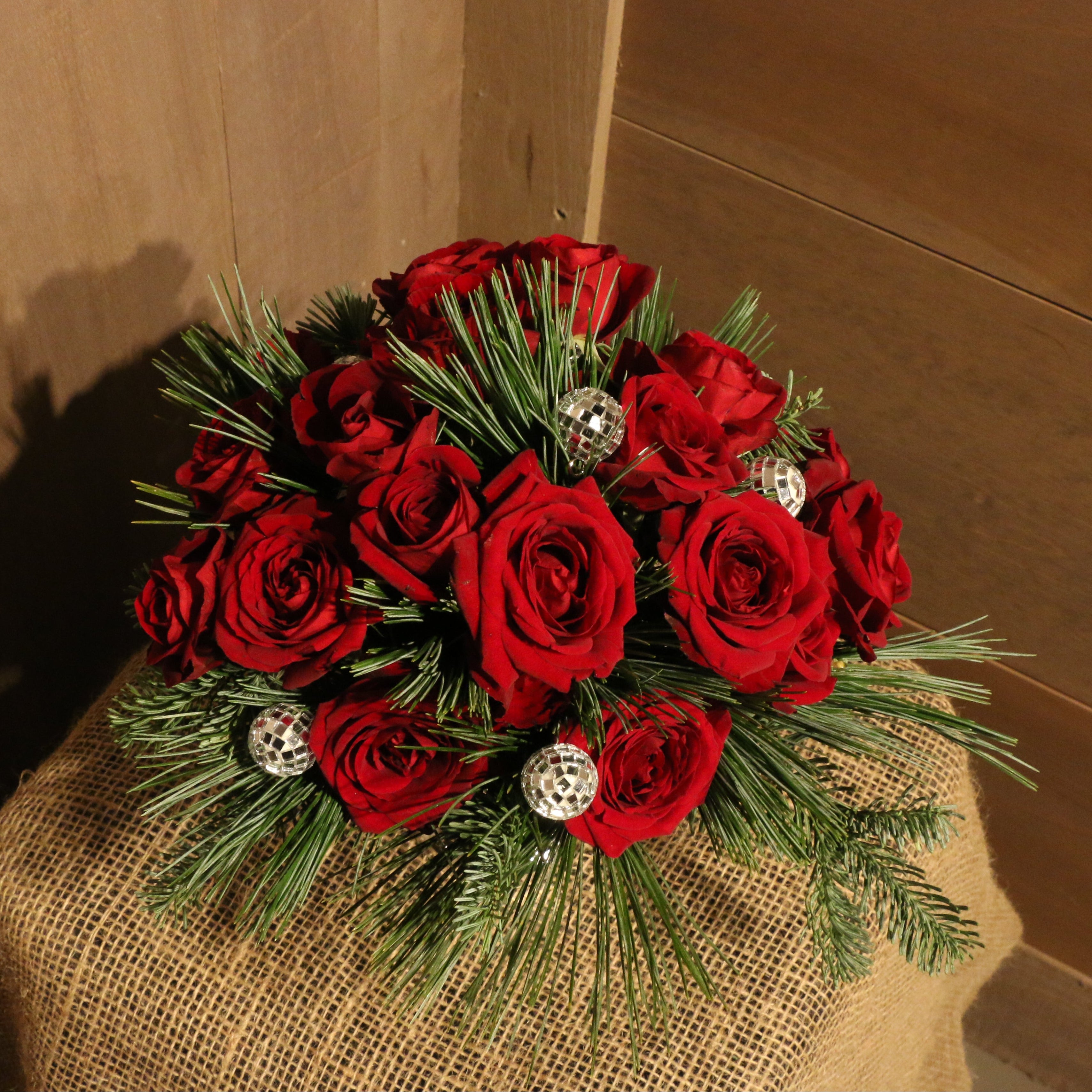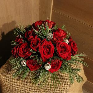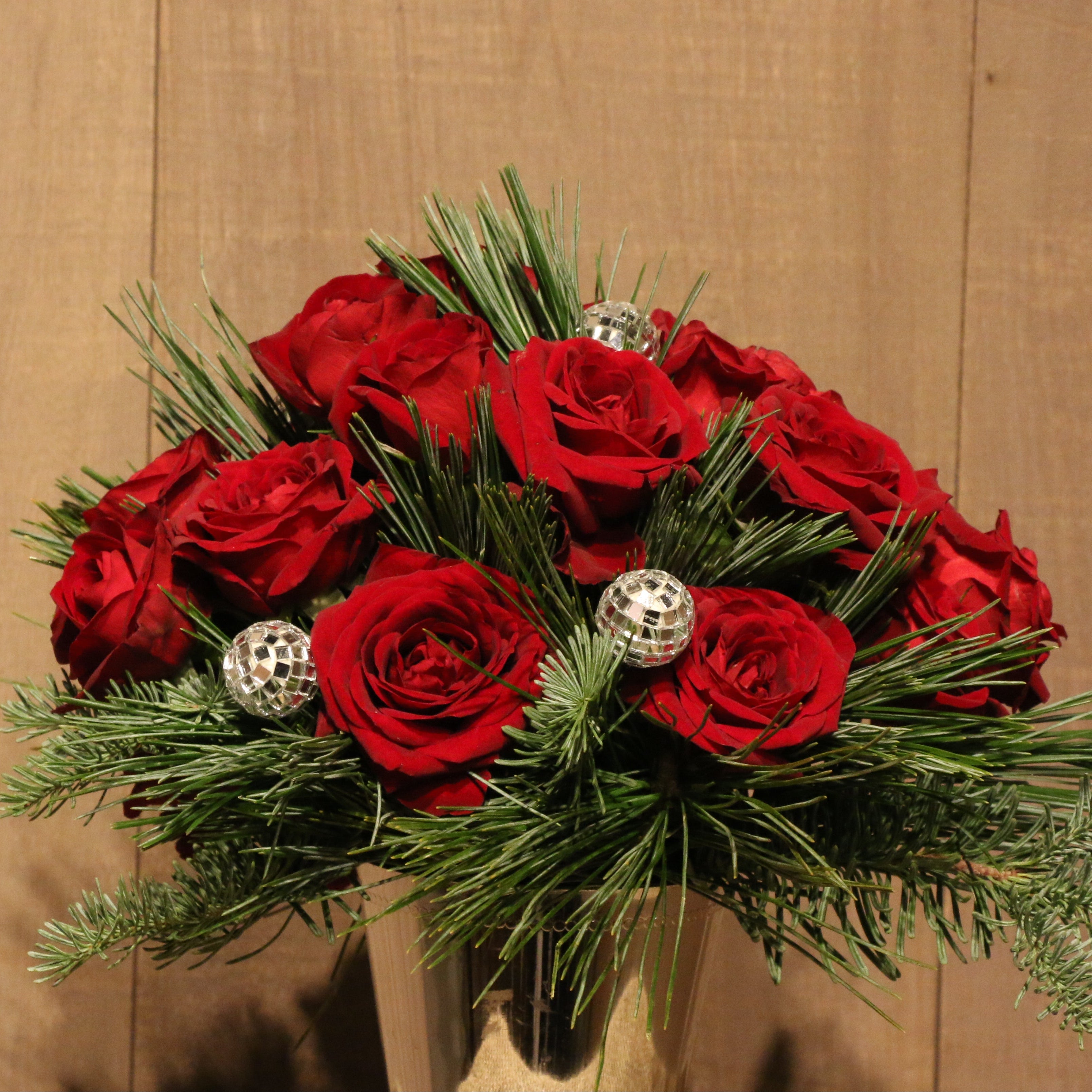 Bold and festive, Holiday Sparkle shines with radiant red roses and shimmering disco balls — the perfect mix of classic Christmas and modern glam. Arrangement is ~ 9" H x 8"W.